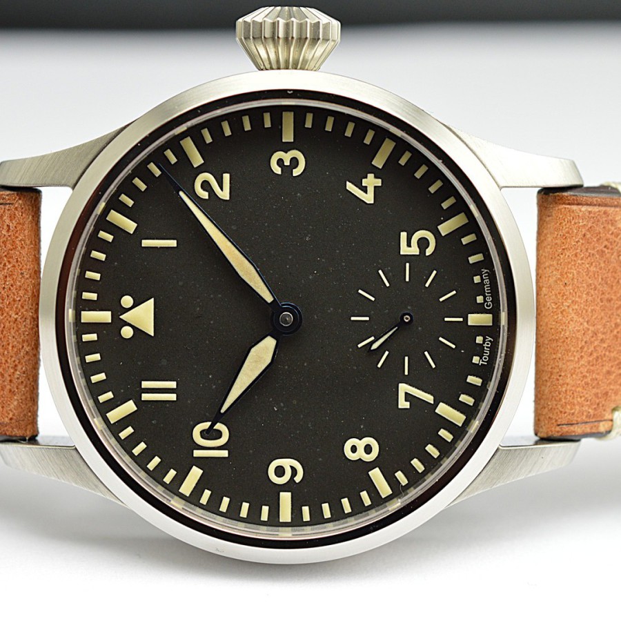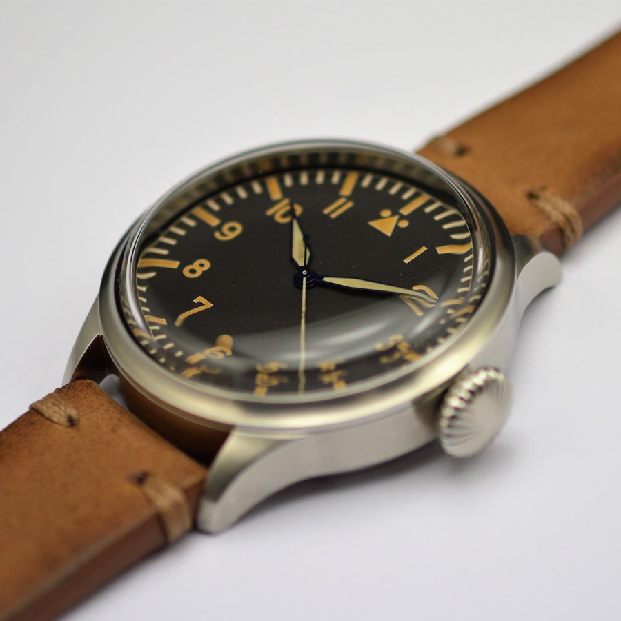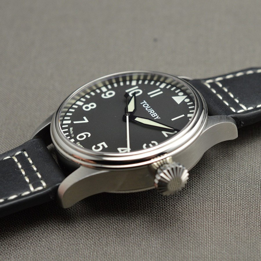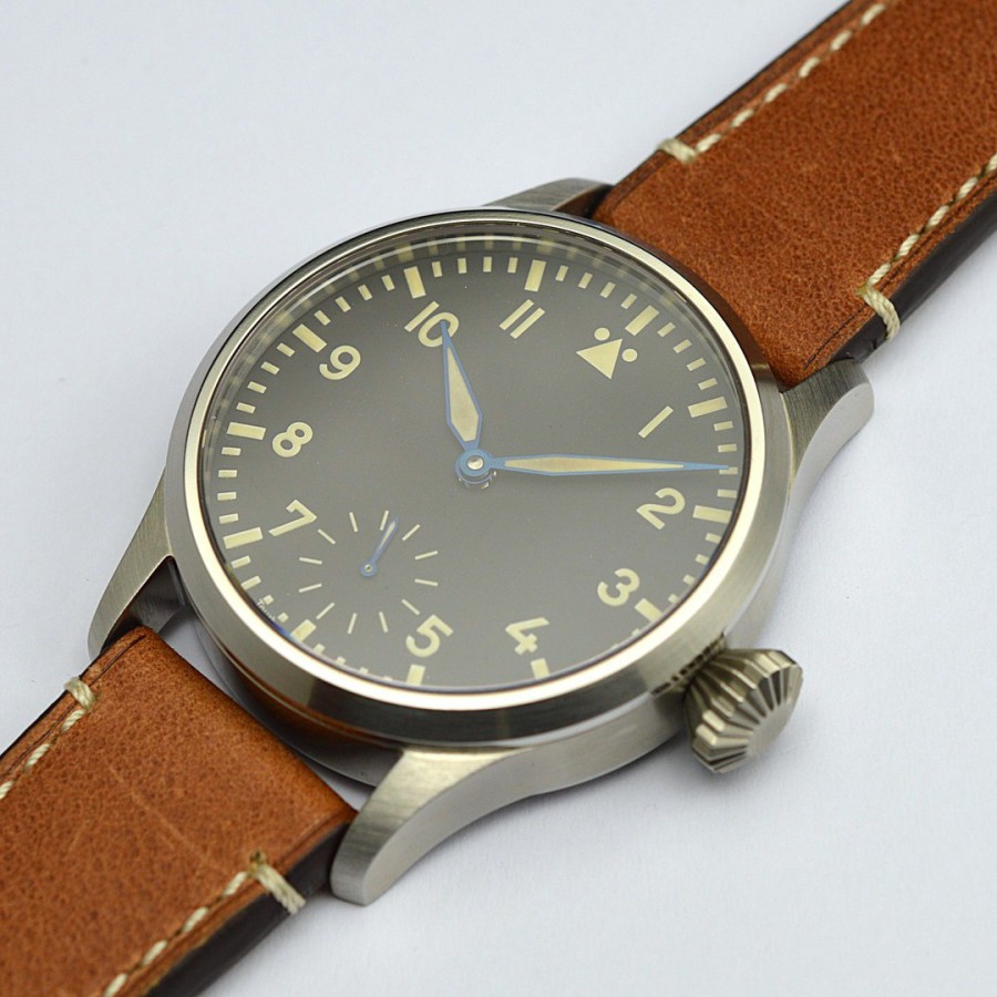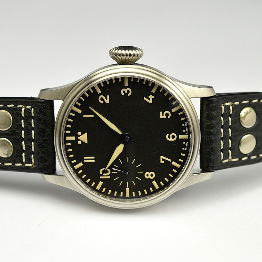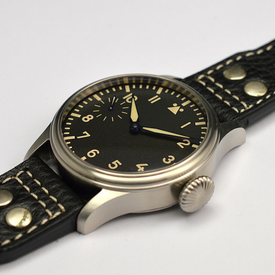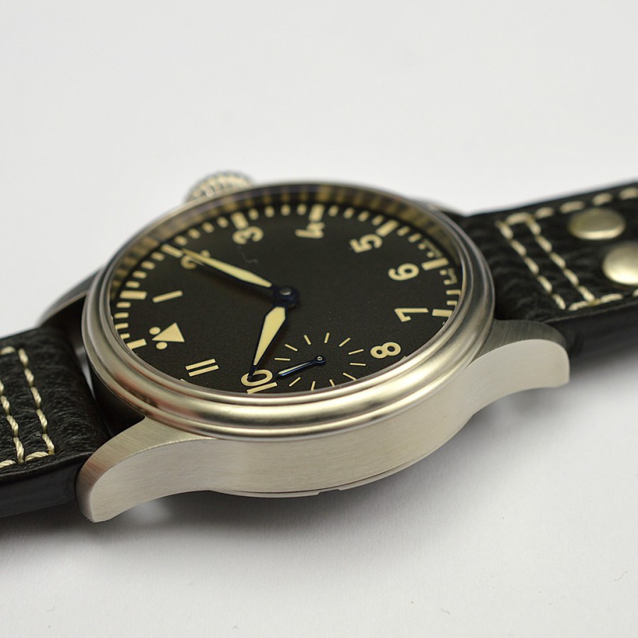 40.5 mm diameter, 10.6 mm height overall, 48 mm lug to lug,, 50 m WR, new (unworn), Stainless steel, Domed (box) sapphire front crystal, Sapphire case back, Black dial, Heat-blued steel hands, Super-Luminova OR, Handwound movement, Swiss Made ETA 6498-1 Premium Rose, 18.000 A/h, 48 hours power reserve, Adjusted in 5 positions, Genuine Leather strap, Tang buckle