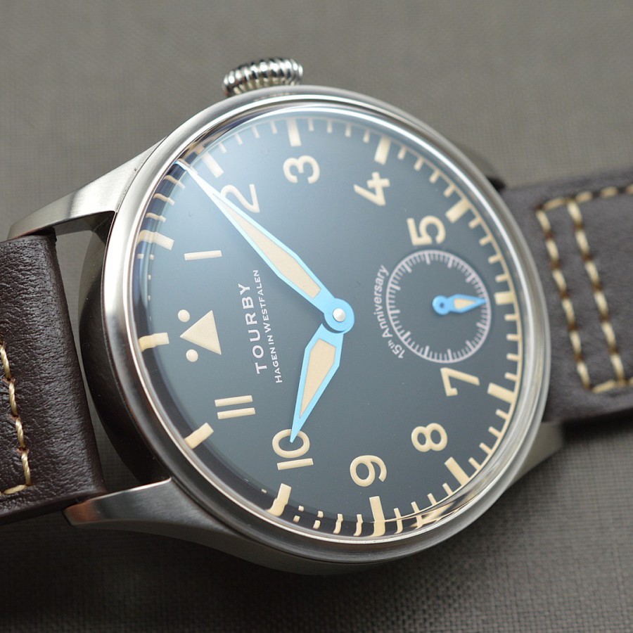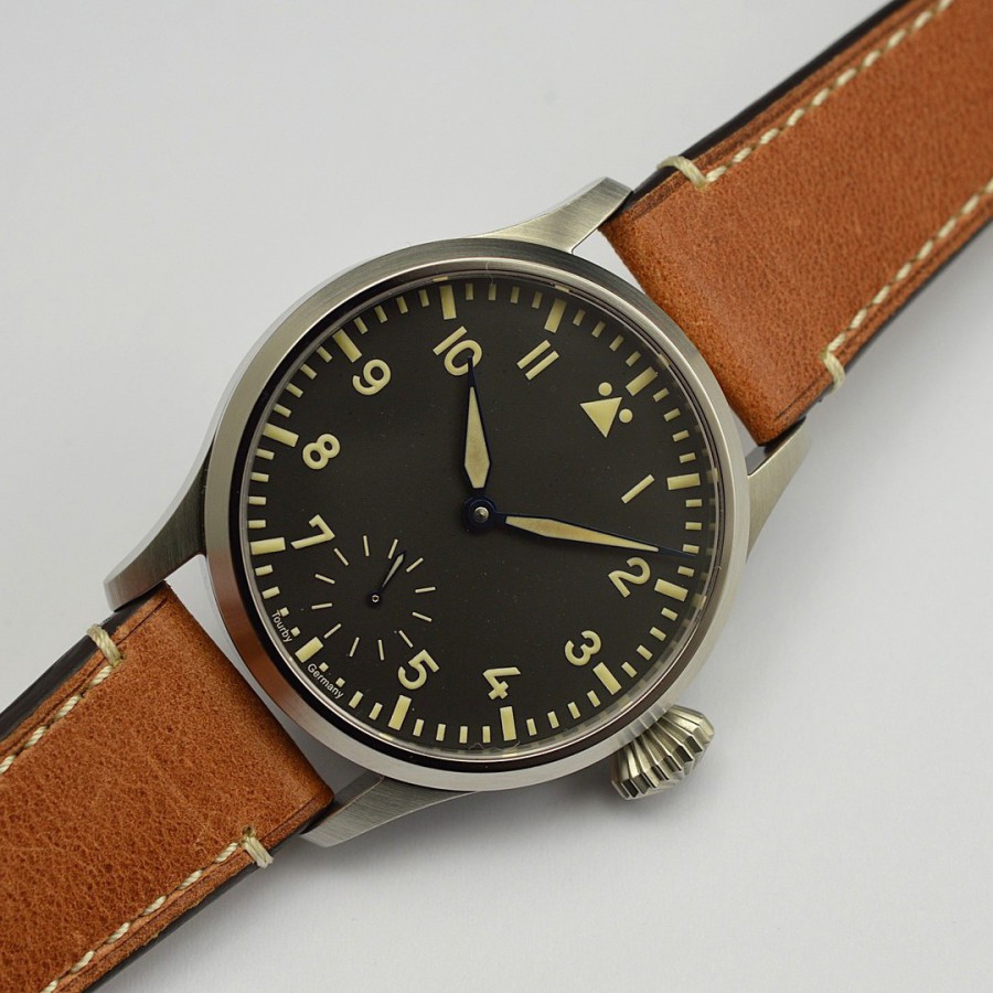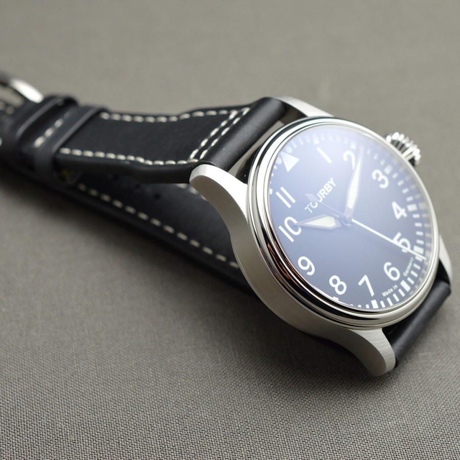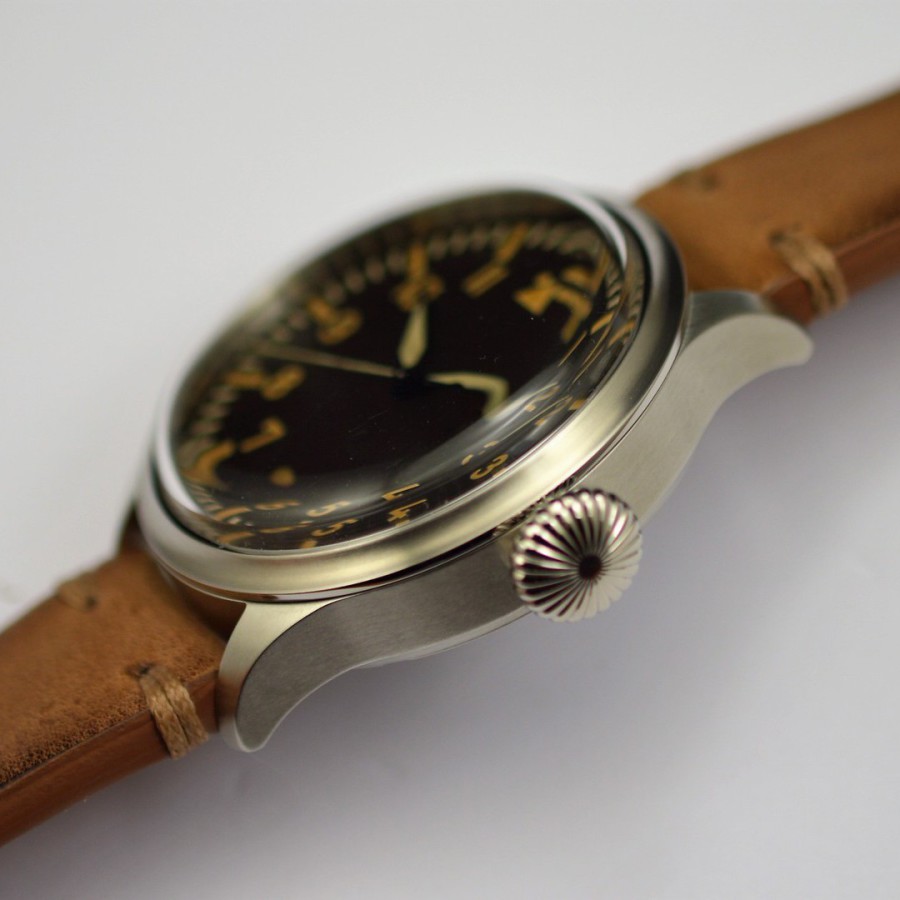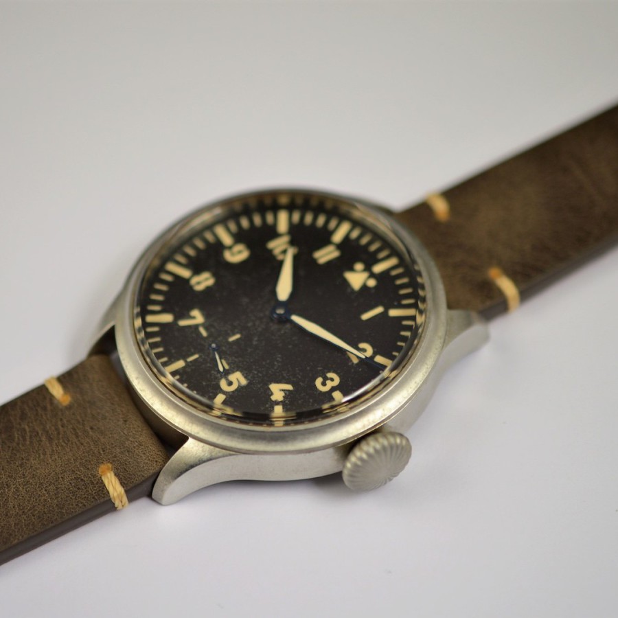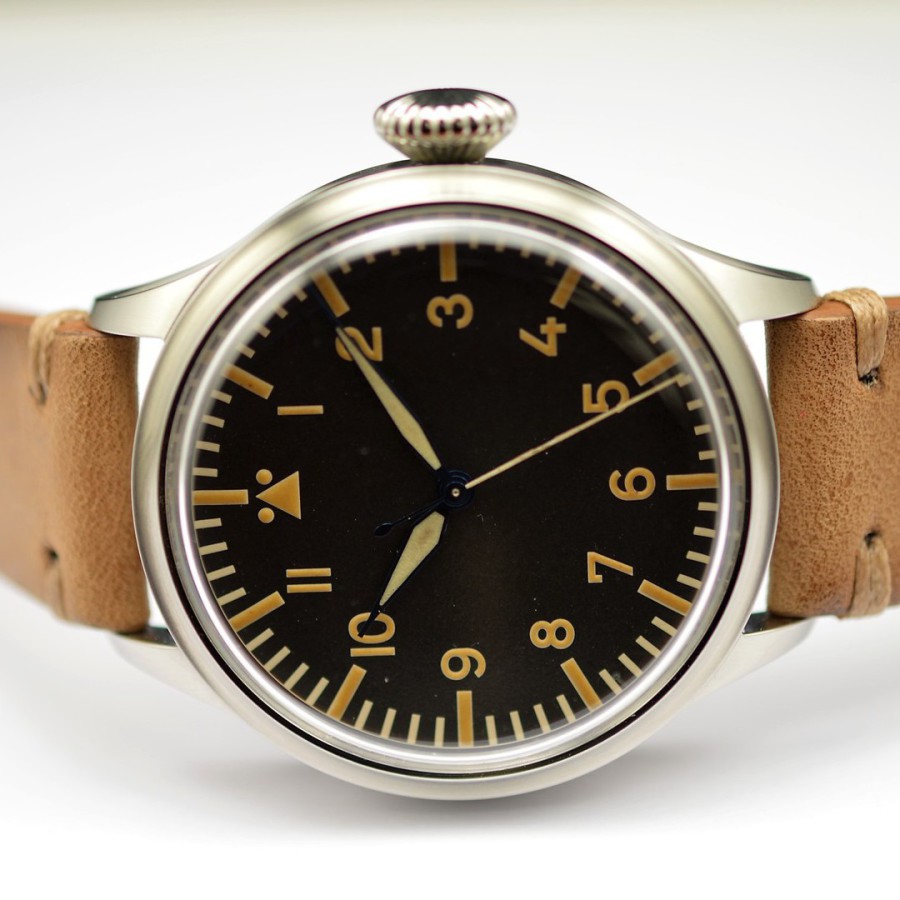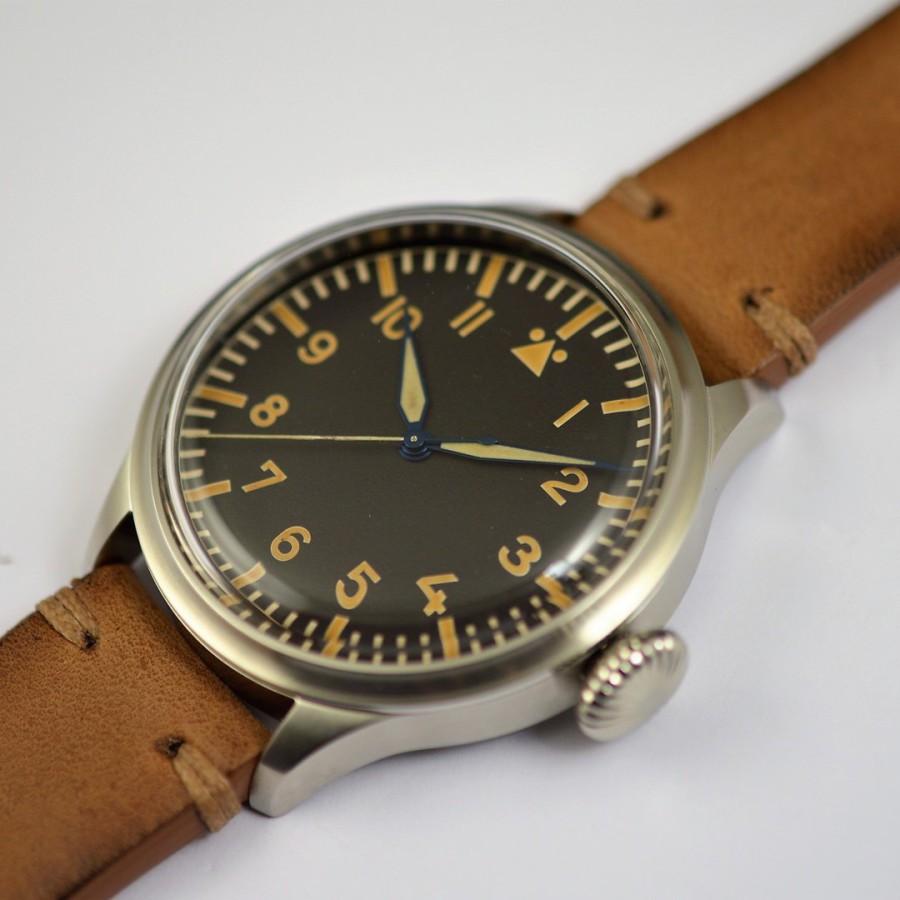 40.5 mm diameter, 10.6 mm height overall, 48 mm lug to lug,, 50 m WR, new (unworn), Stainless steel, Domed (box) sapphire front crystal, Sapphire case back, Black dial, Heat-blued steel hands, Super-Luminova OR, Handwound movement, Swiss Made ETA 6498-1 Premium Rose, 18.000 A/h, 48 hours power reserve, Adjusted in 5 positions, Genuine Leather strap, Tang buckle