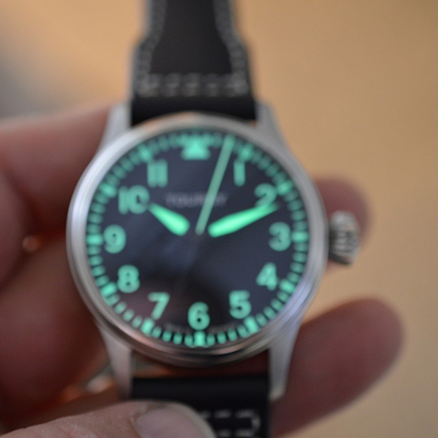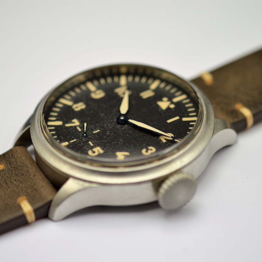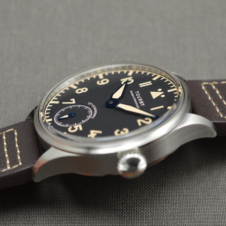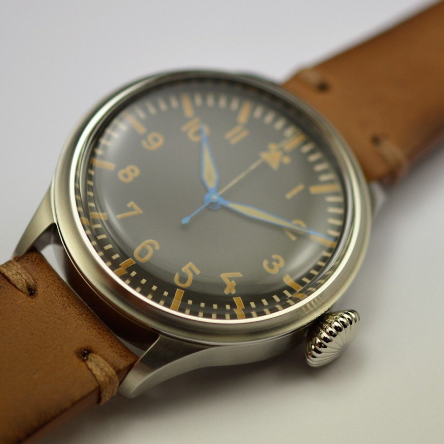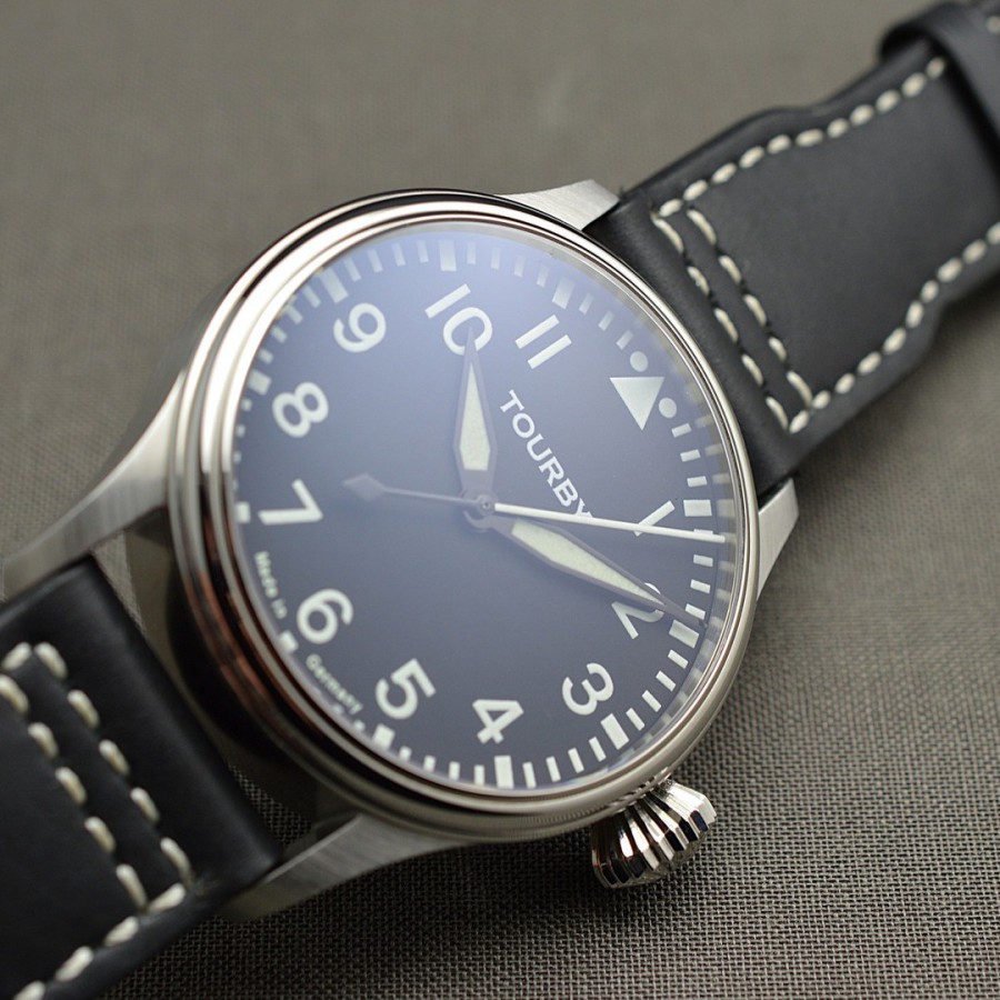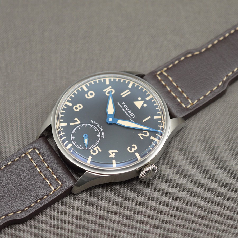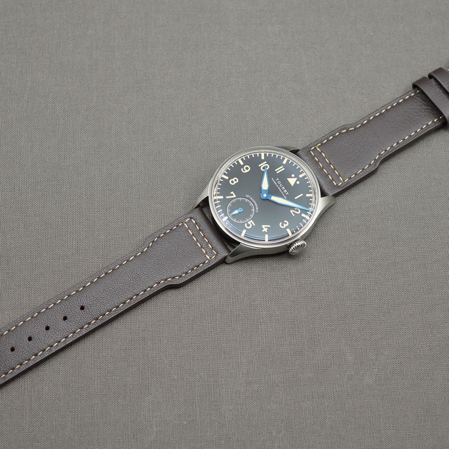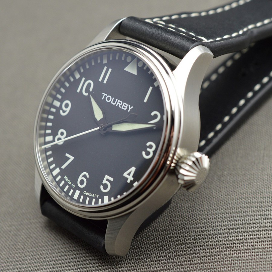 40.5 mm diameter, 10.6 mm height overall, 48 mm lug to lug,, 50 m WR, new (unworn), Stainless steel, Domed (box) sapphire front crystal, Sapphire case back, Black dial, Heat-blued steel hands, Super-Luminova OR, Handwound movement, Swiss Made ETA 6498-1 Premium Rose, 18.000 A/h, 48 hours power reserve, Adjusted in 5 positions, Genuine Leather strap, Tang buckle