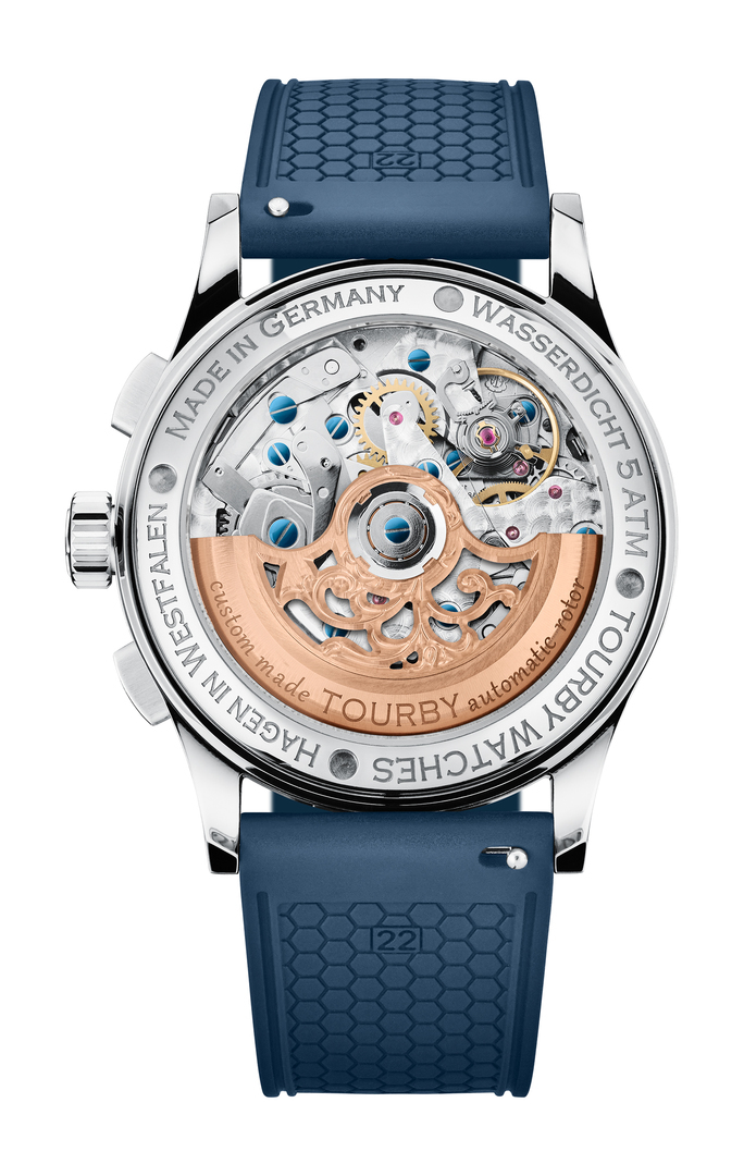 For the movement, we chose an ETA Valjoux 7753 Top Grade because of the arrangement of the totalisers and the nostalgic date adjustment via a hidden pusher at 10 o'clock. Of course also available in the highest quality level with Glucydur Chronometer balance and our exclusive manufacture rotor.