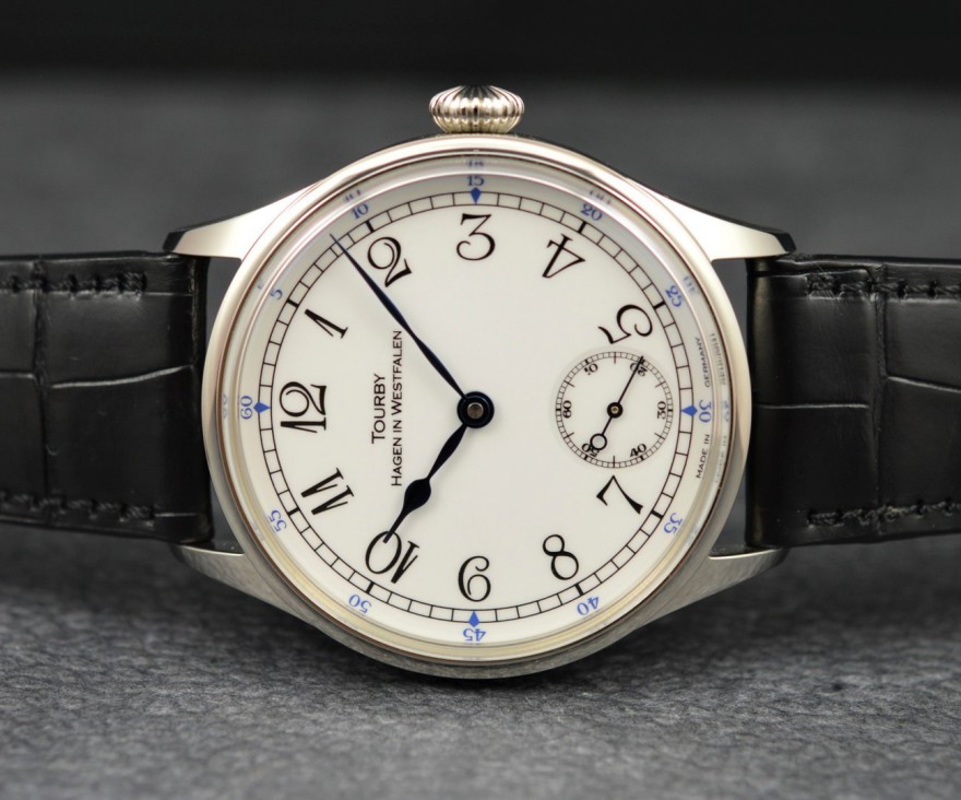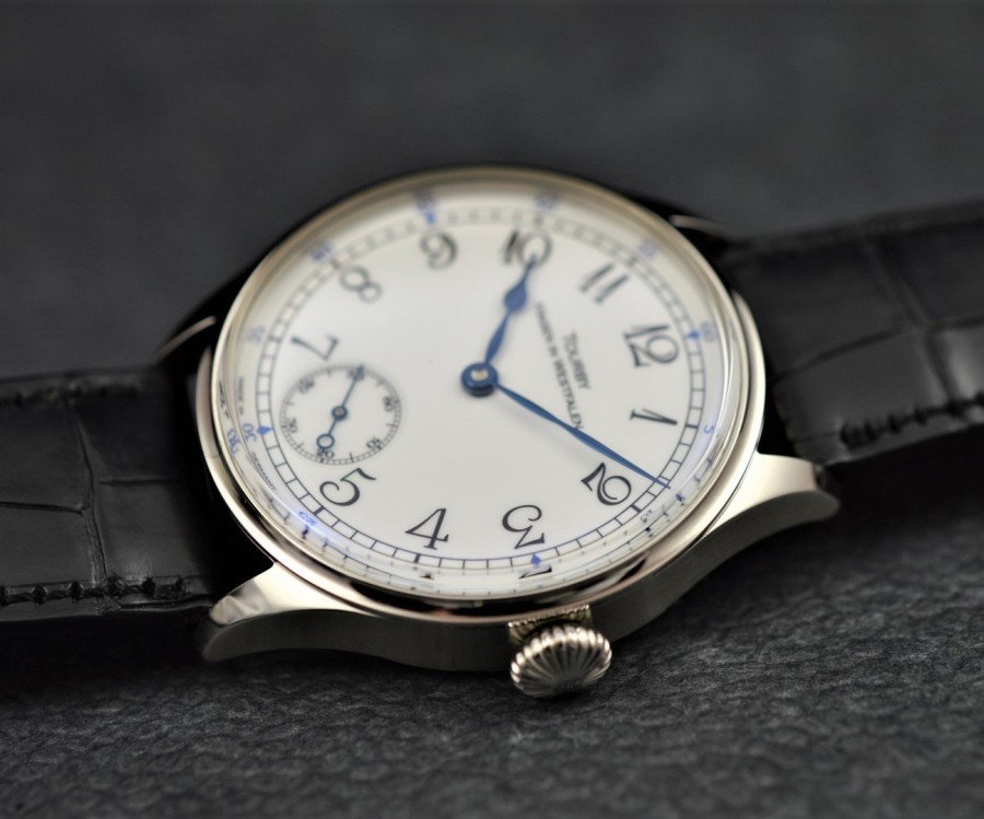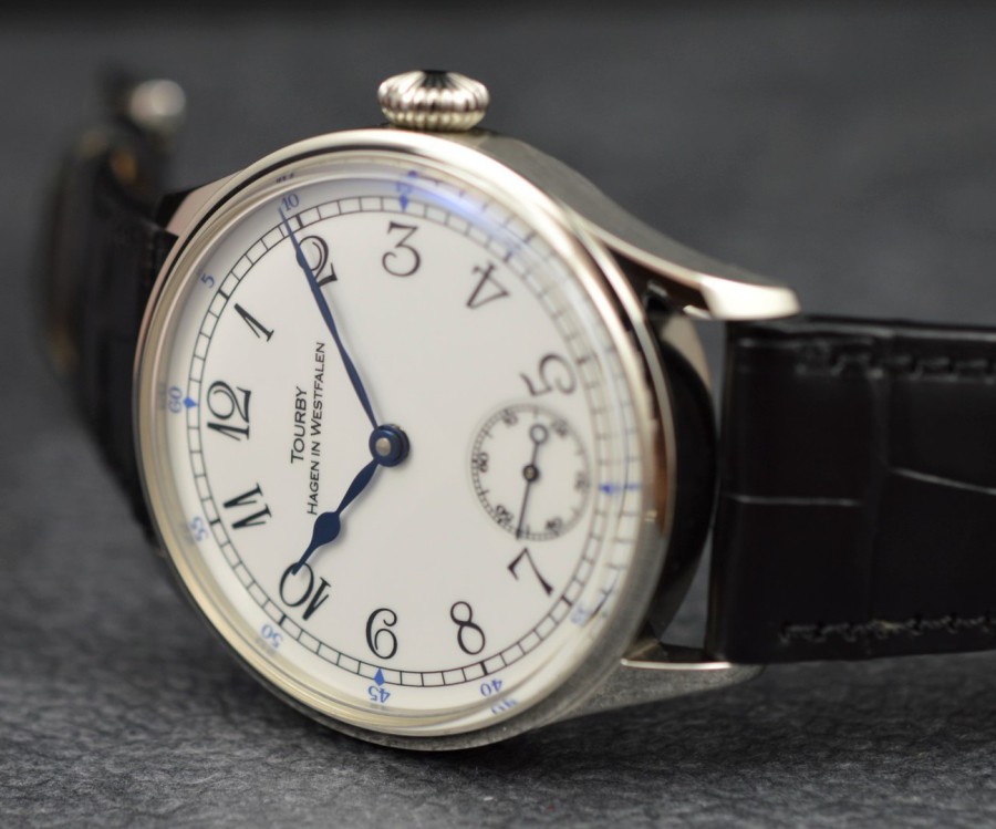 Enamel is a glass-hard protective layer that is fired onto metal surfaces. This process - carried out in the furnace - is very complex and expensive. The material has to go through countless work steps until the finished end product. Enamel is temperature and acid resistant. The very smooth surface prevents the dial from rusting and is also very resistant to scratches, dust or dirt. The print on the dial is partially or entirely applied by hand and then subsequently baked. Enamel dials often last for many centuries. Between 1660 - 1880 the dials of high-quality pocket watches were made exclusively of enamel. Later, for cost reasons, metal or brass dials were also used. Today, dials are almost exclusively made of brass, or very rarely of silver. The Tourby Enamel dials are made from 925 Sterling Silver and the surface is given an enamel finish to resemble the original enamel dial as closely as possible. The dials are made in a small special workshop in Germany and are of extremely high quality.