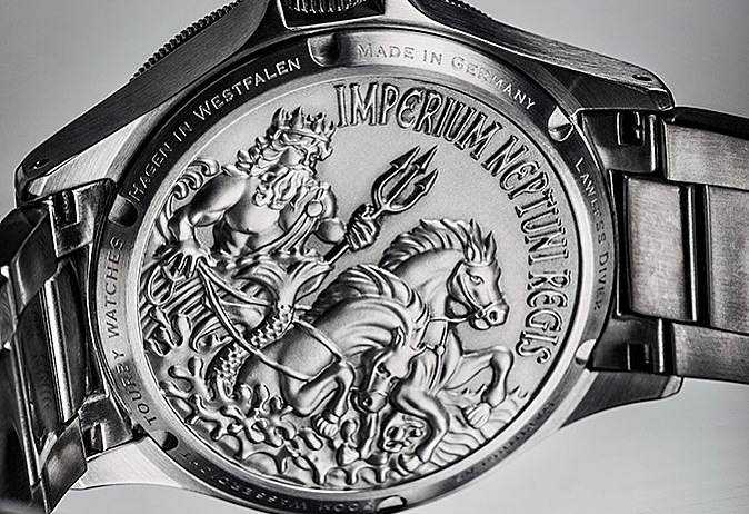 The showpiece of the watch is the stamped steel case back. It is a first in the watchmaking industry to apply this intricate engraving to the hard stainless steel with such great detail. The very deep engraving creates a kind of 3D character of the image. We gave our case maker a very difficult task and accepted the extremely high cost to produce this intricate engraving. The cost of the engraved back is 5 times the cost of a normal steel back. Although this type of engraving has never been tried before, we took on this project not to come out with just any diving watch, but to create something new and original. However, as with all our watches, we keep the design very simple and timeless.