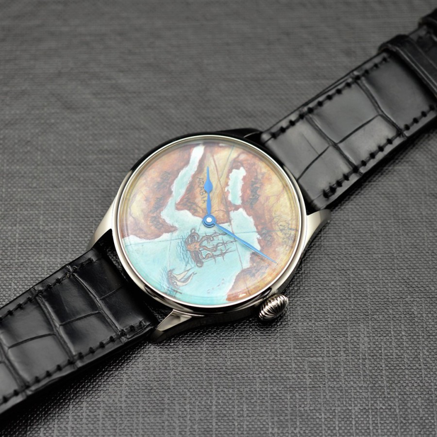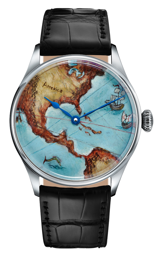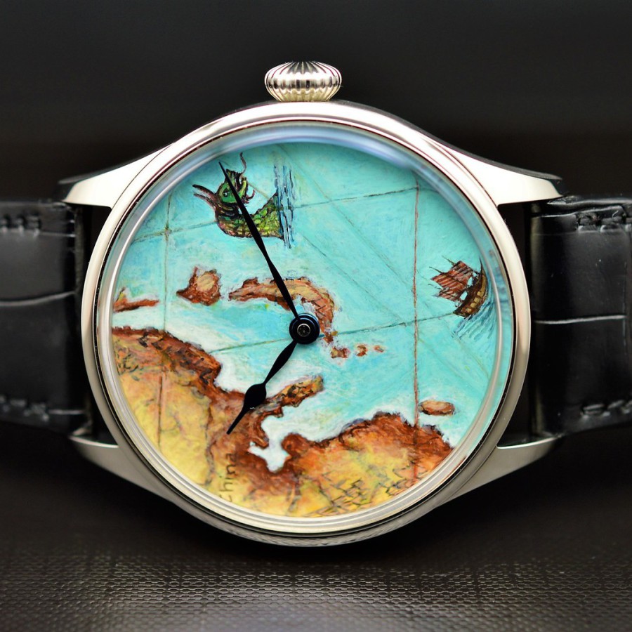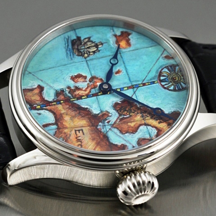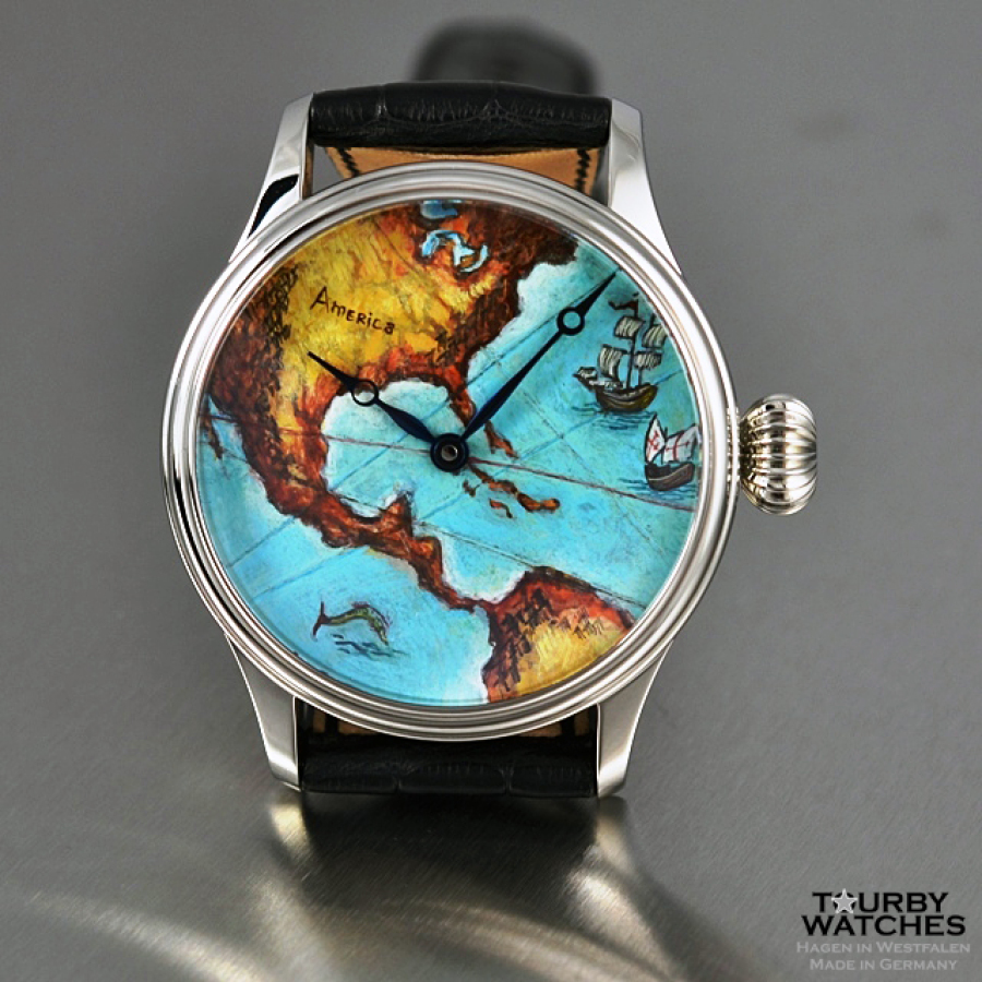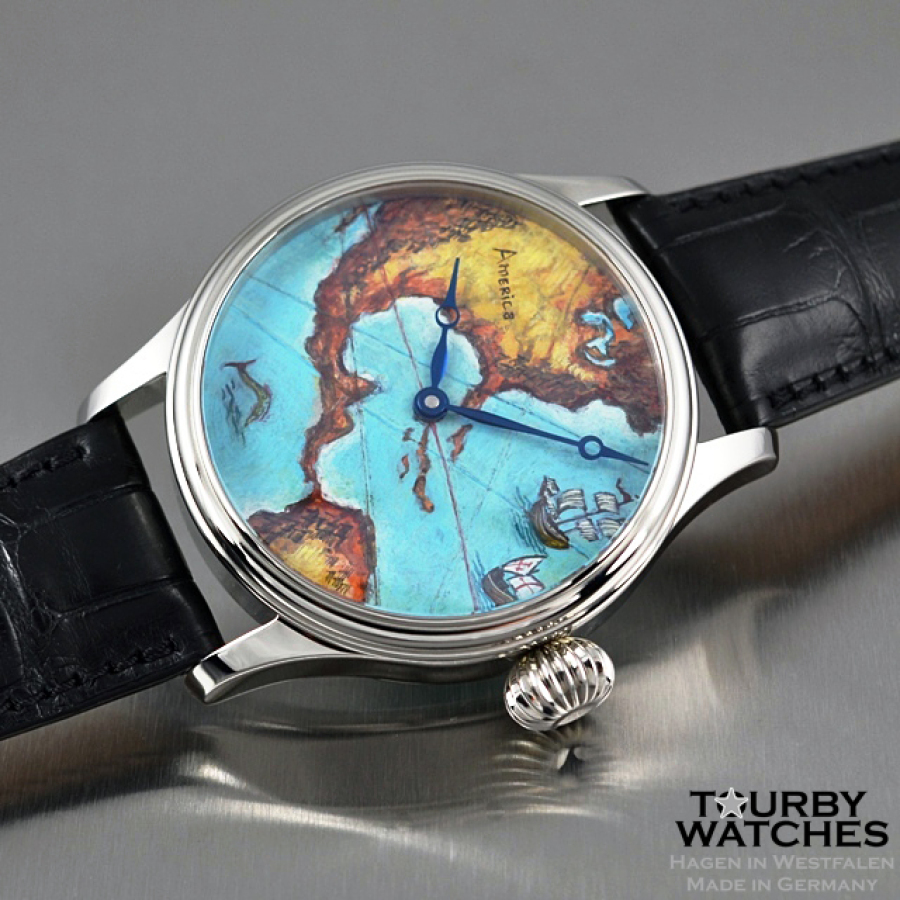 In the "Tourby Around The World" models, 5 clocks (representing the respective continents of Europe, America, Asia, Australia and Arabia) were provided with hand paintings. The hand-painted dials show sections of a centuries-old seafaring world map. This work was applied by a very well-known American artist (with European roots) in a very complex and filigree way. Only through personal contact and after repeated requests did the artist agree to paint the dials for Tourby. Since her pictures are sold for large sums worldwide, she had no need for further orders. But she liked the idea so much that she made an exception for us. Of course, you should never push a true artist or set a time limit. So Tourby waited over 4 years until the dials were finally delivered. And as you can see, the long wait was worth it.