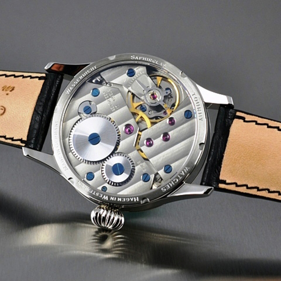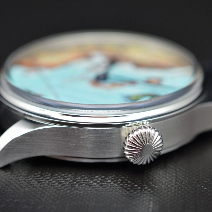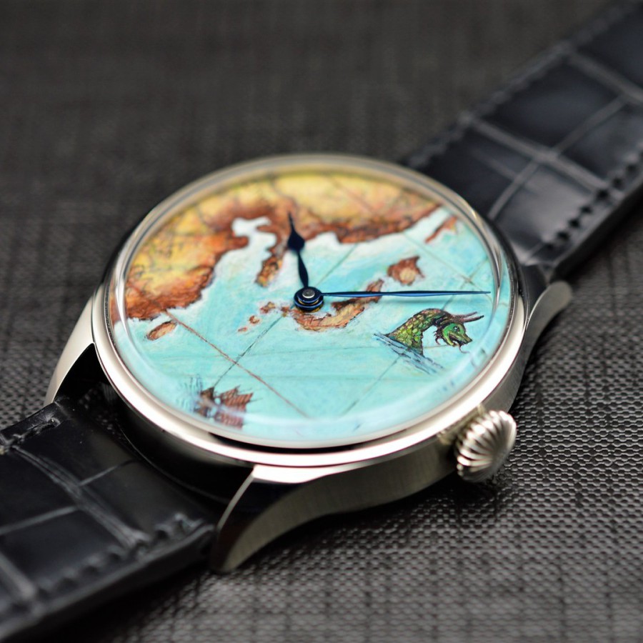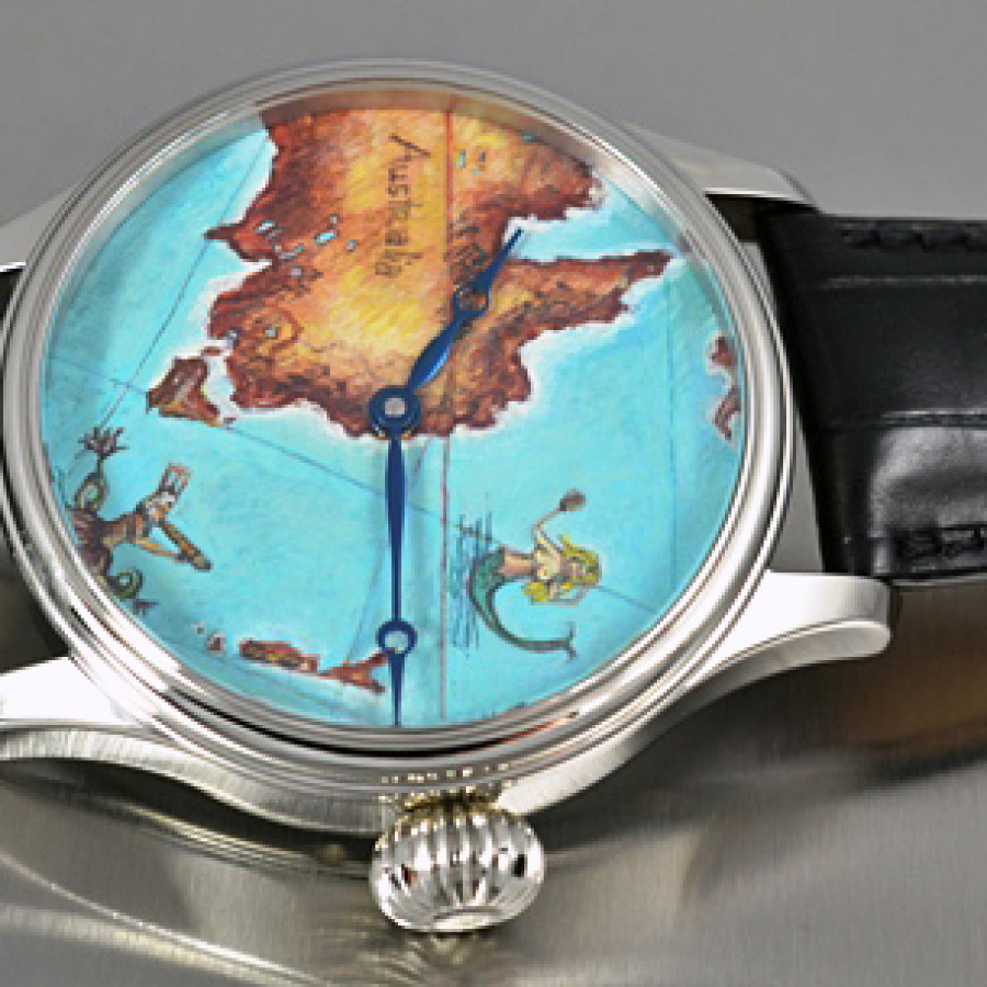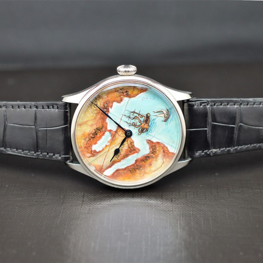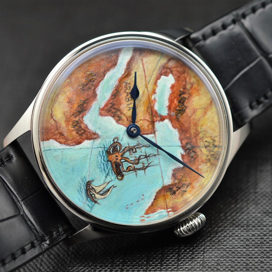In the "Tourby Around The World" models, 5 clocks (representing the respective continents of Europe, America, Asia, Australia and Arabia) were provided with hand paintings. The hand-painted dials show sections of a centuries-old seafaring world map. This work was applied by a very well-known American artist (with European roots) in a very complex and filigree way. Only through personal contact and after repeated requests did the artist agree to paint the dials for Tourby. Since her pictures are sold for large sums worldwide, she had no need for further orders. But she liked the idea so much that she made an exception for us. Of course, you should never push a true artist or set a time limit. So Tourby waited over 4 years until the dials were finally delivered. And as you can see, the long wait was worth it.